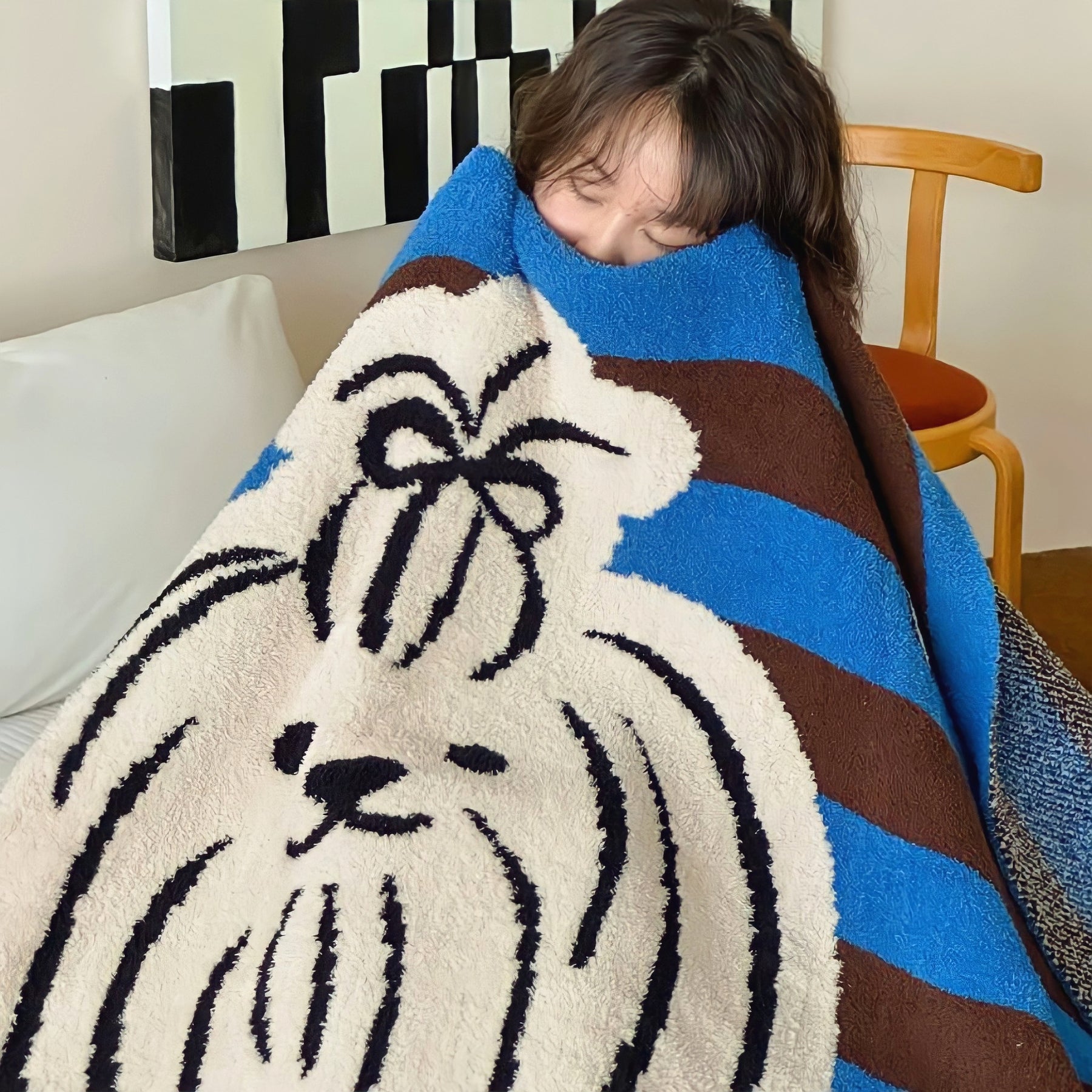 サイズは約130×170cmと大判タイプ。ソファやベッド、車の中でも使いやすく、ひざ掛けやお昼寝用、インテリアとしても活躍します。