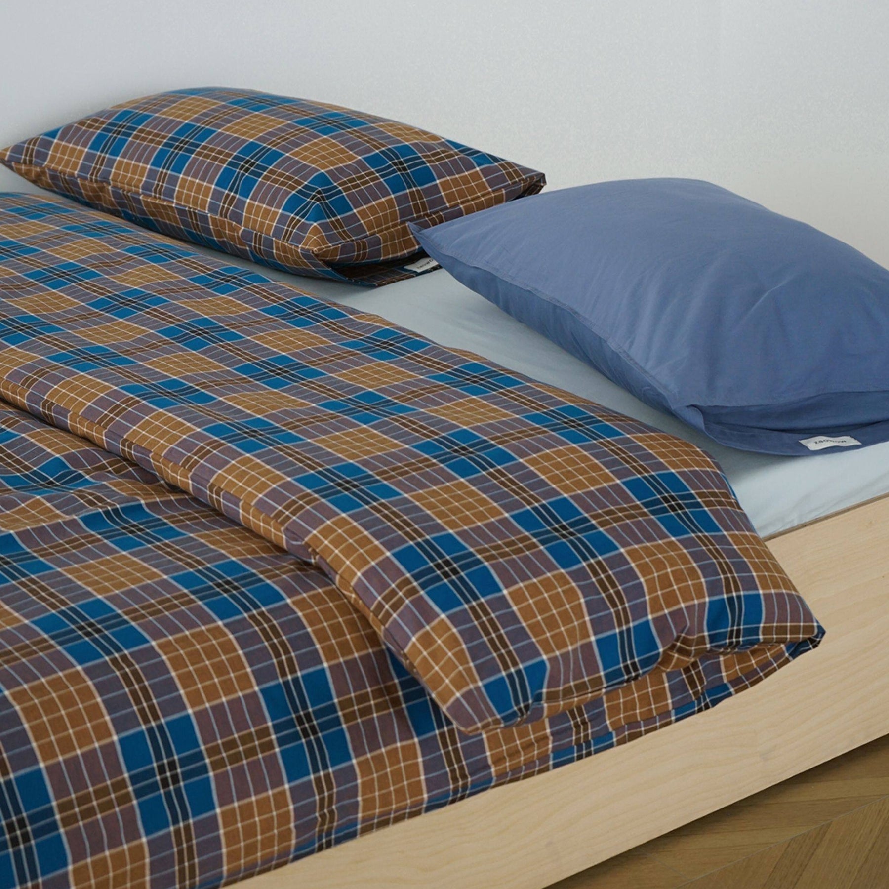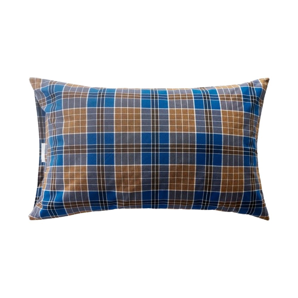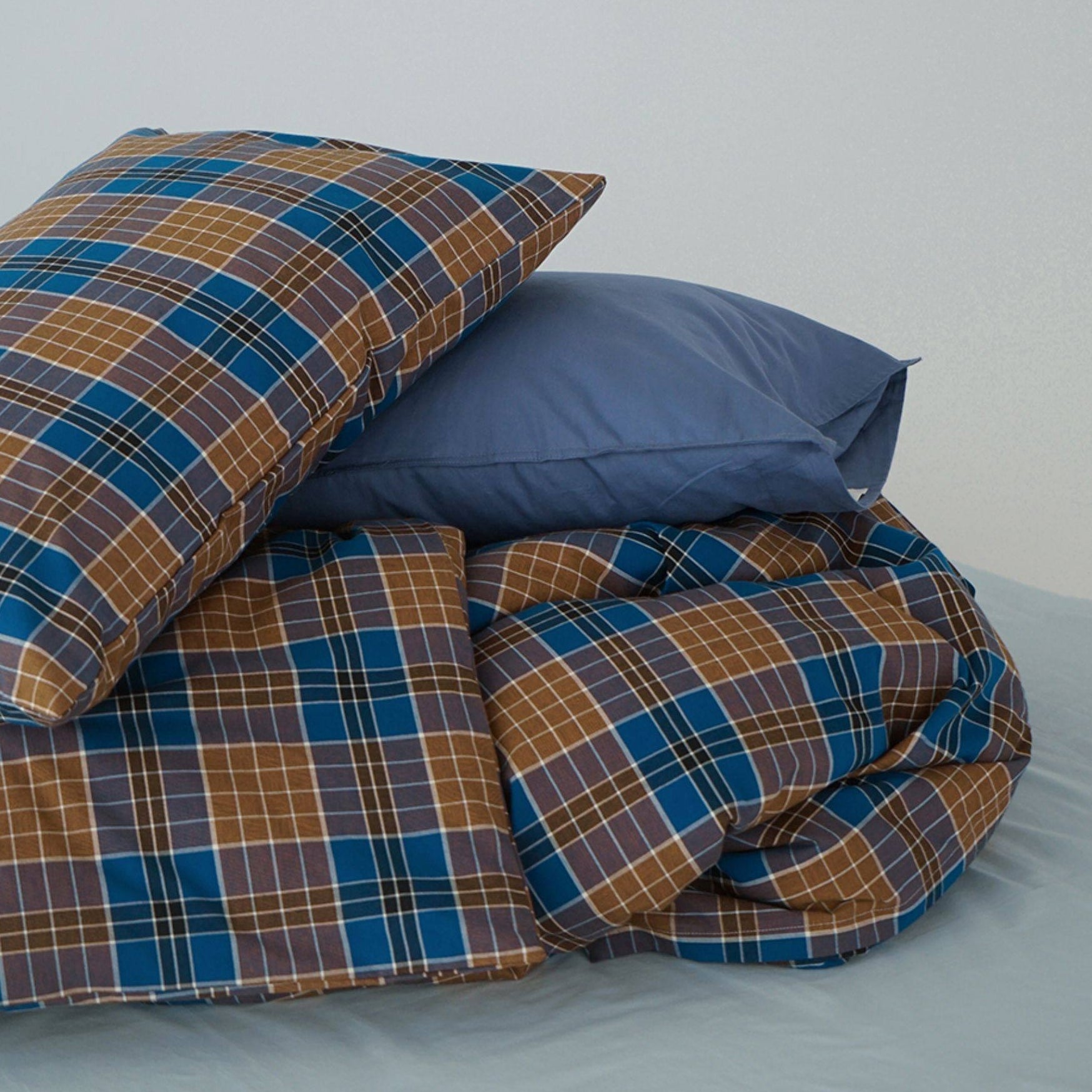 チェック柄同士を組み合わせるのはもちろん、無地のカバーと合わせるのもおすすめ。