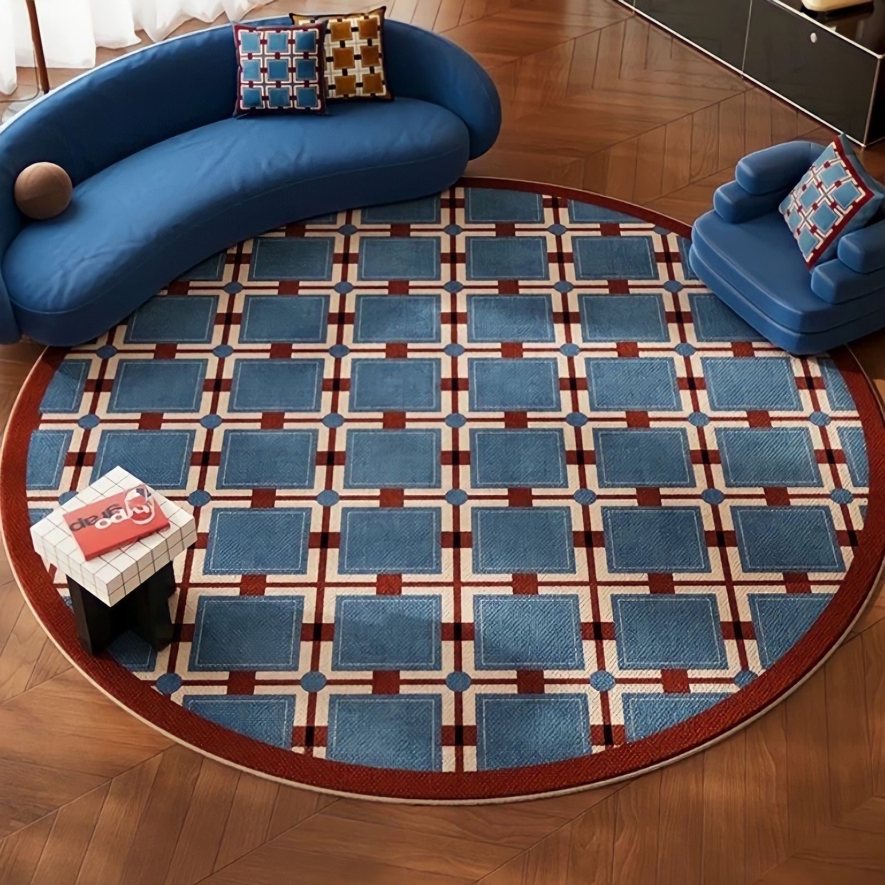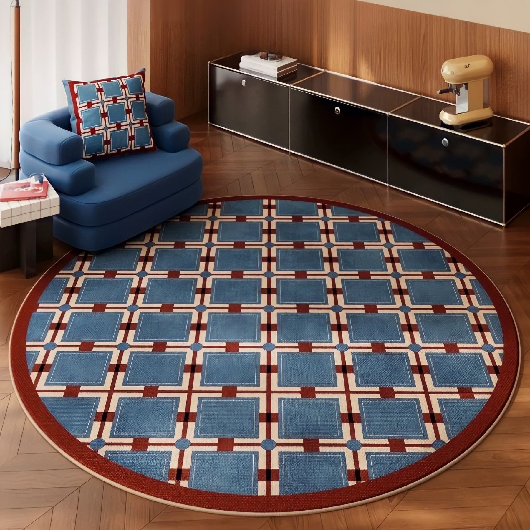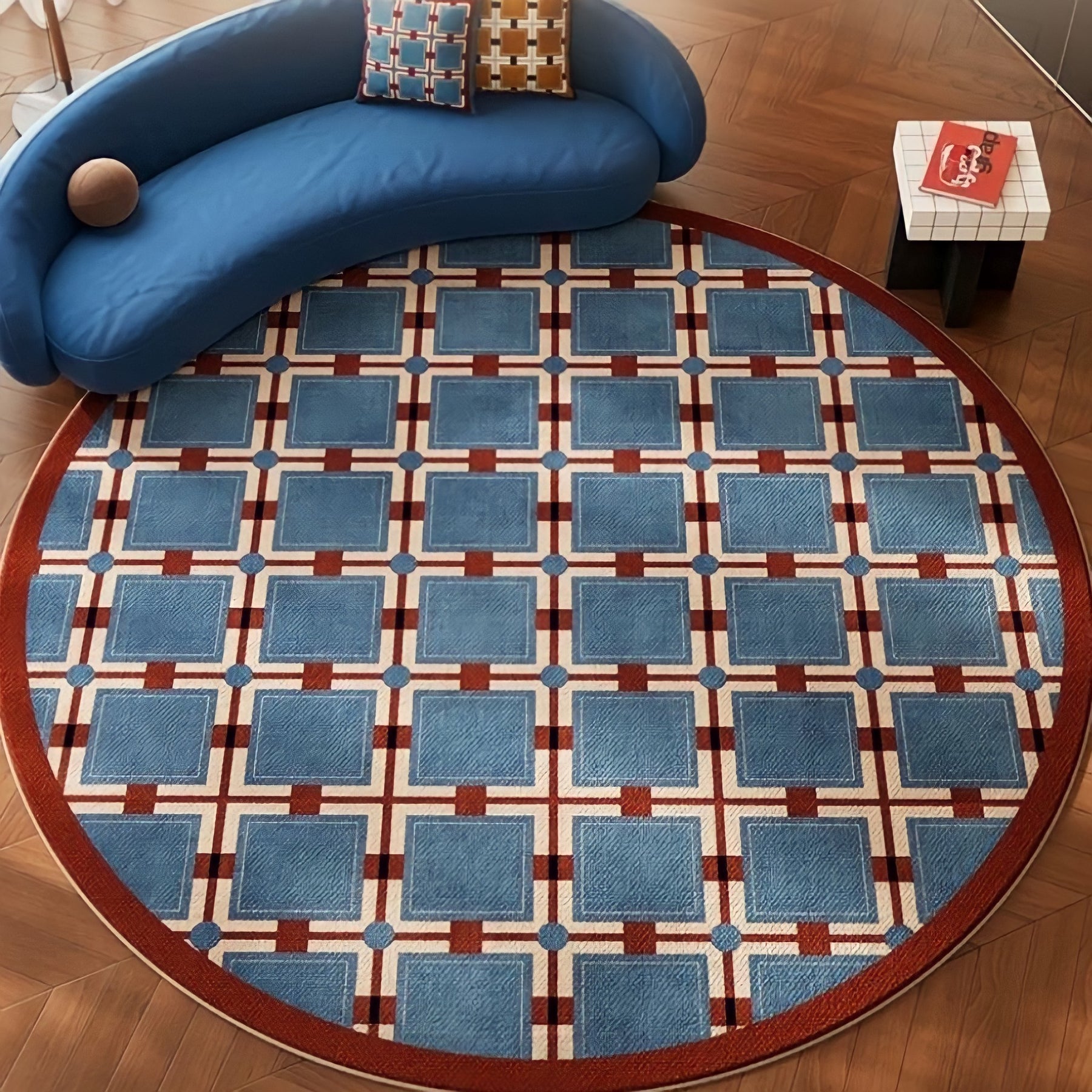 レトロパターンブロックチェックラウンドラグカーペット ブルー