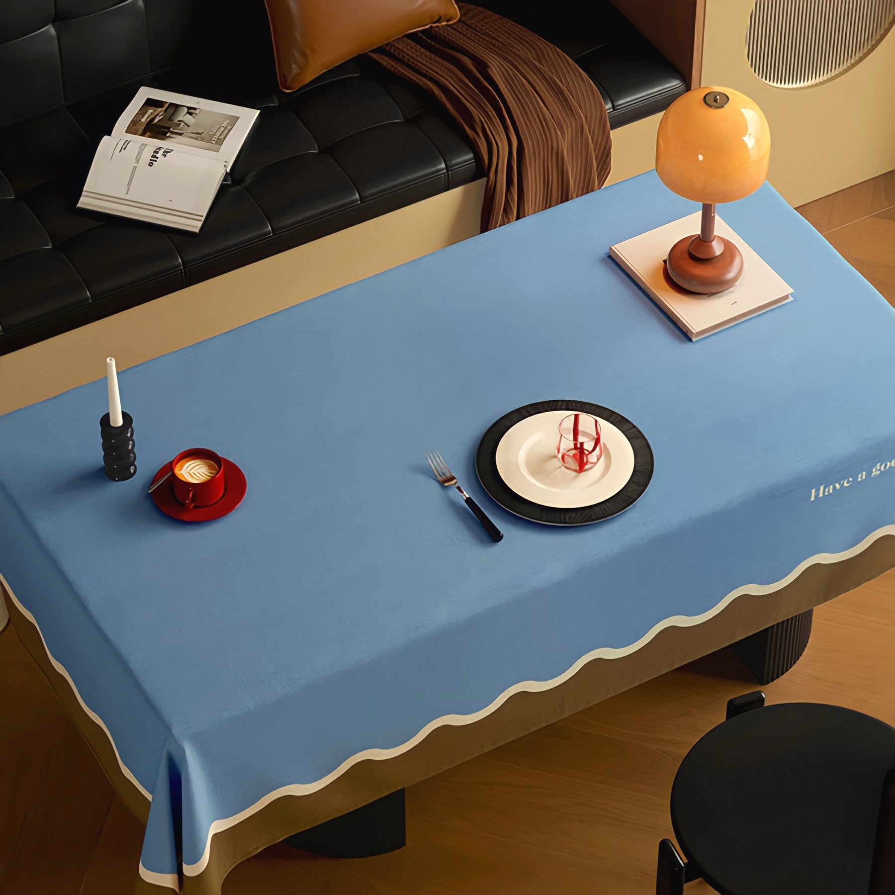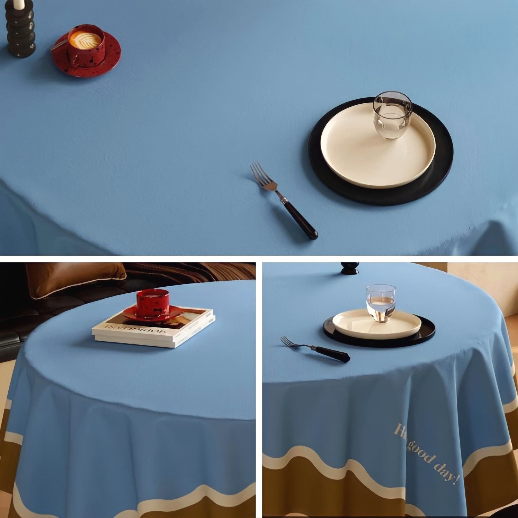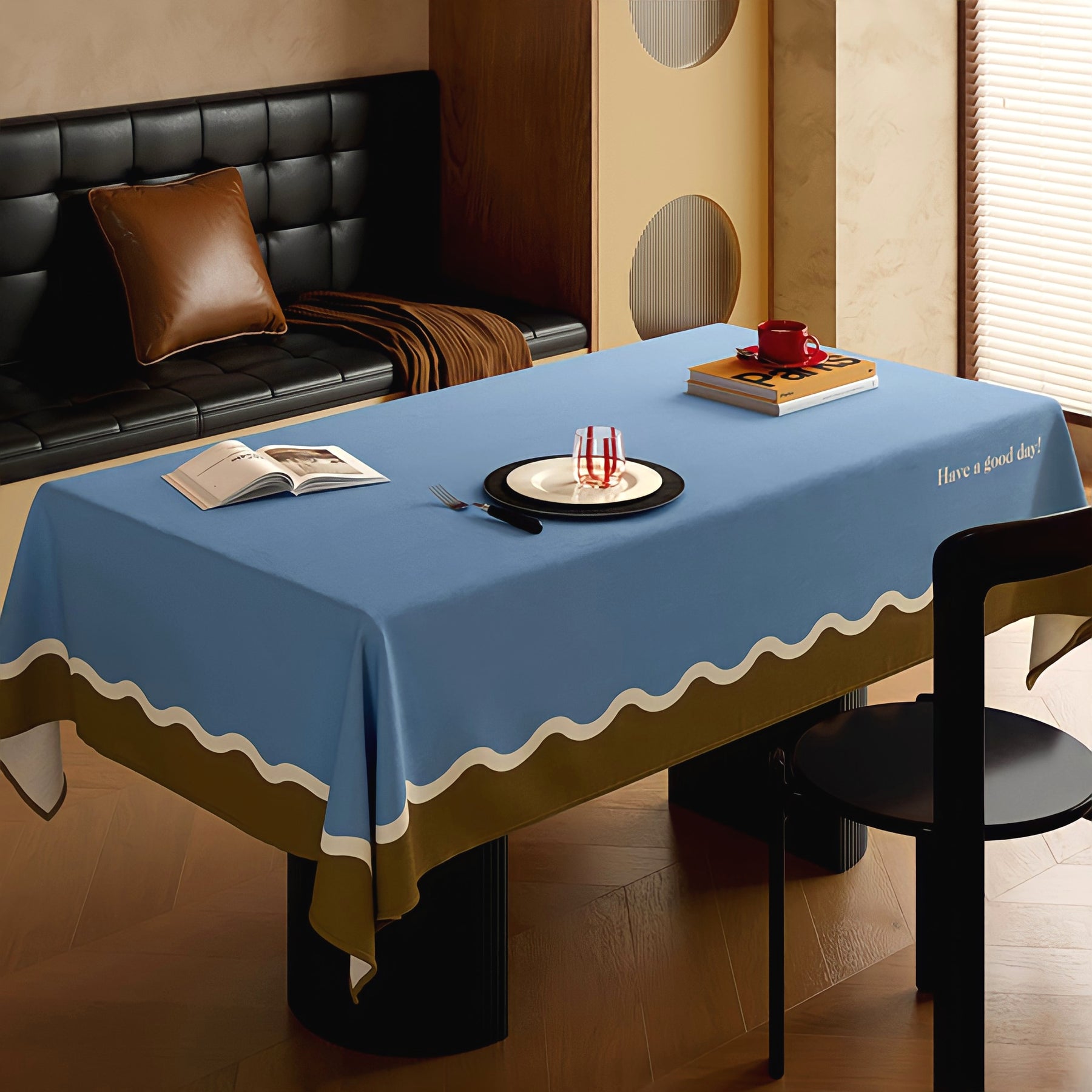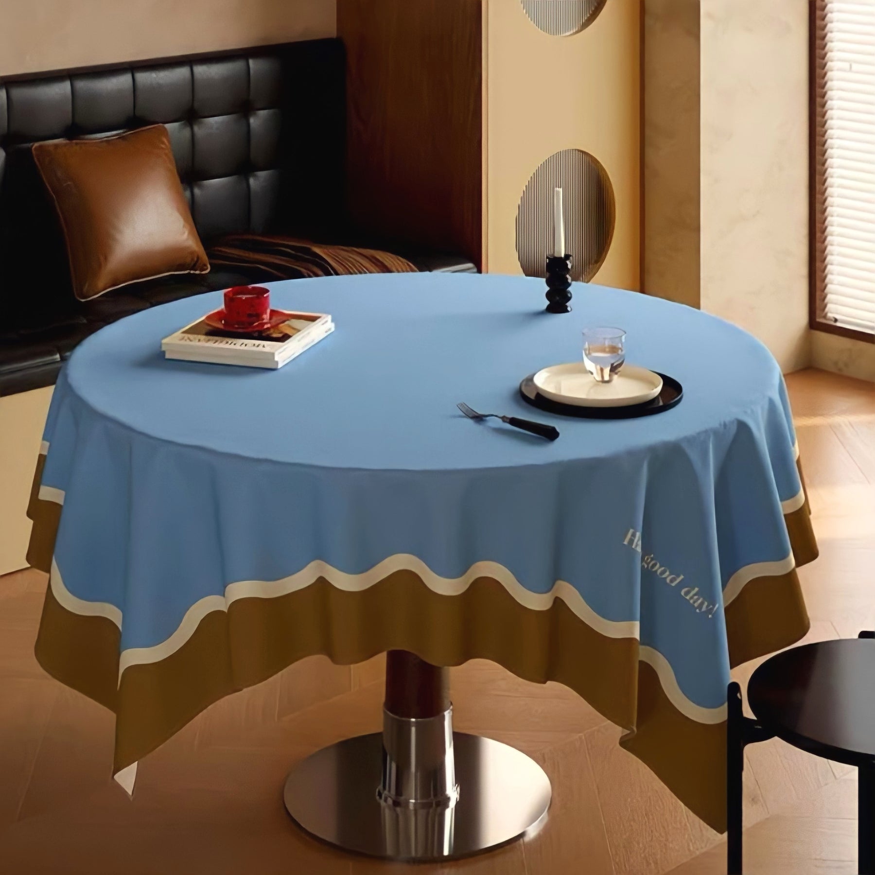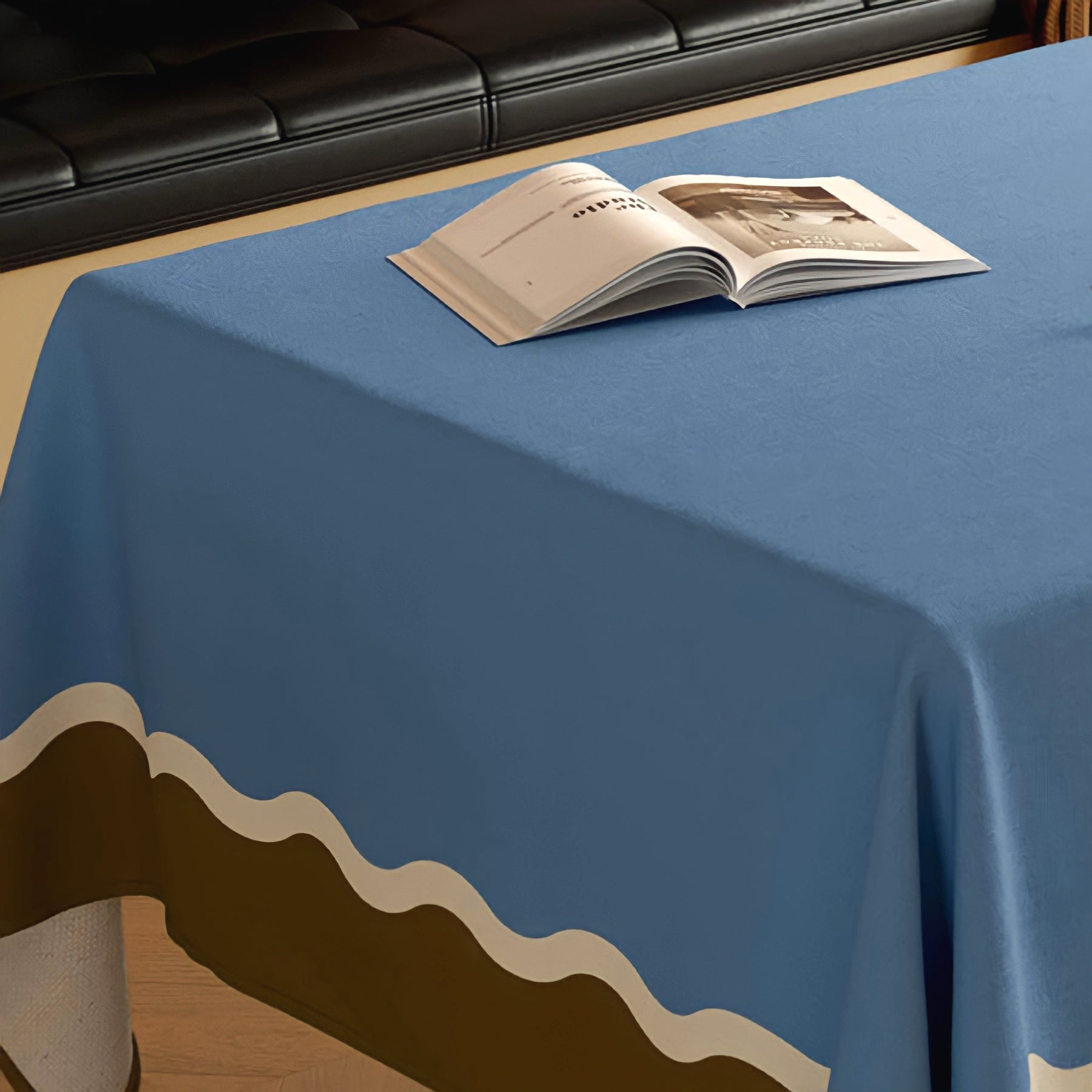 くっきりとした3色の切り替えデザインが目を引くテーブルクロス。