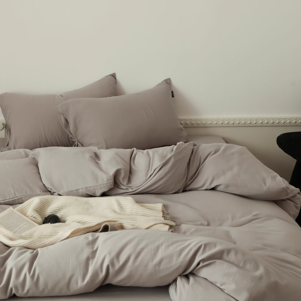 無地のコットン素材に、さりげないリボンのアクセントを加えた寝具セット。