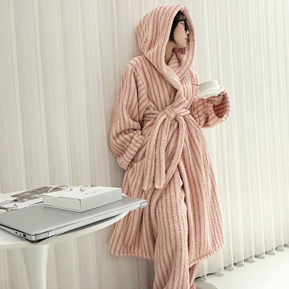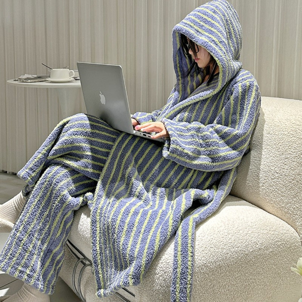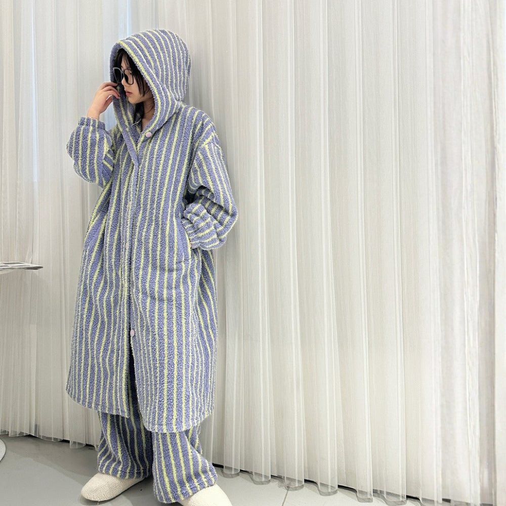 Striped Pattern Fluffy Robe Set Purple Yellow Long