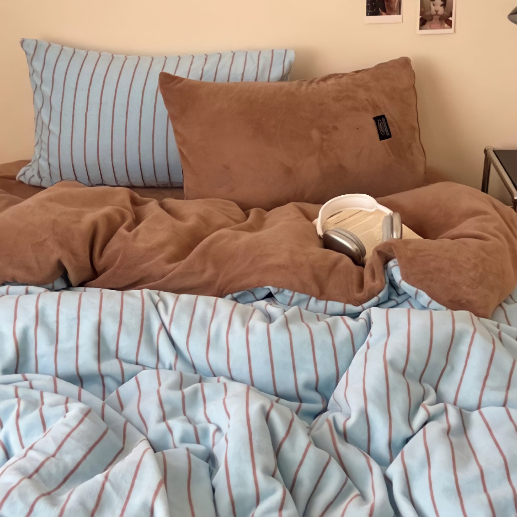 A warm fleece bedding set with a sophisticated pinstripe design.