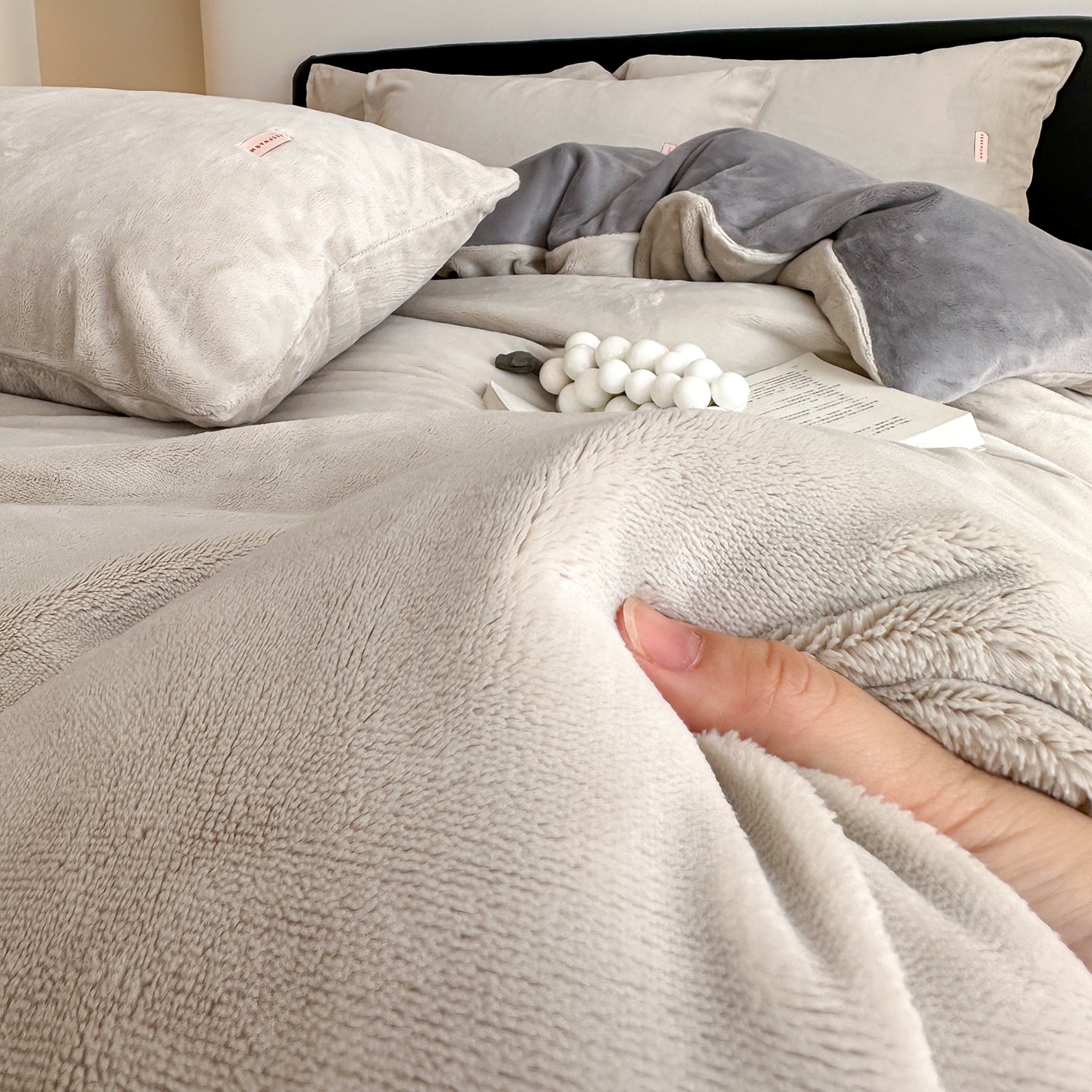 Enjoy the warmth of being wrapped up in this double-color milk fleece bedding set for winter.