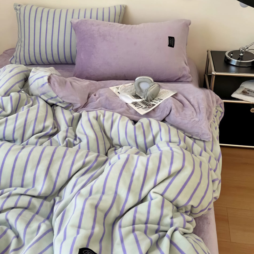 レトロストライプフリース寝具セット グリーンパープル