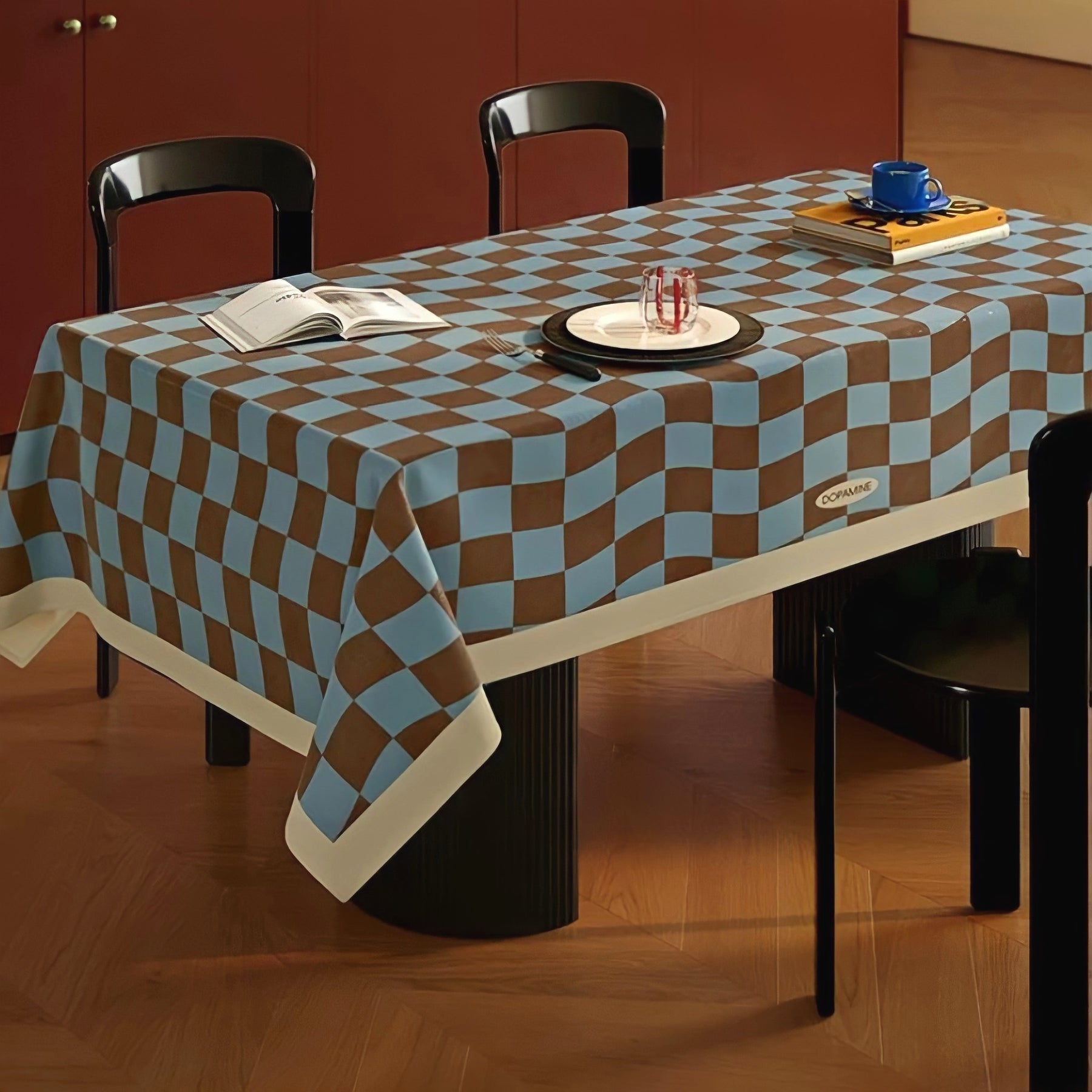 ウェーブのような立体感のあるブロックチェック柄が目を引くテーブルクロス。